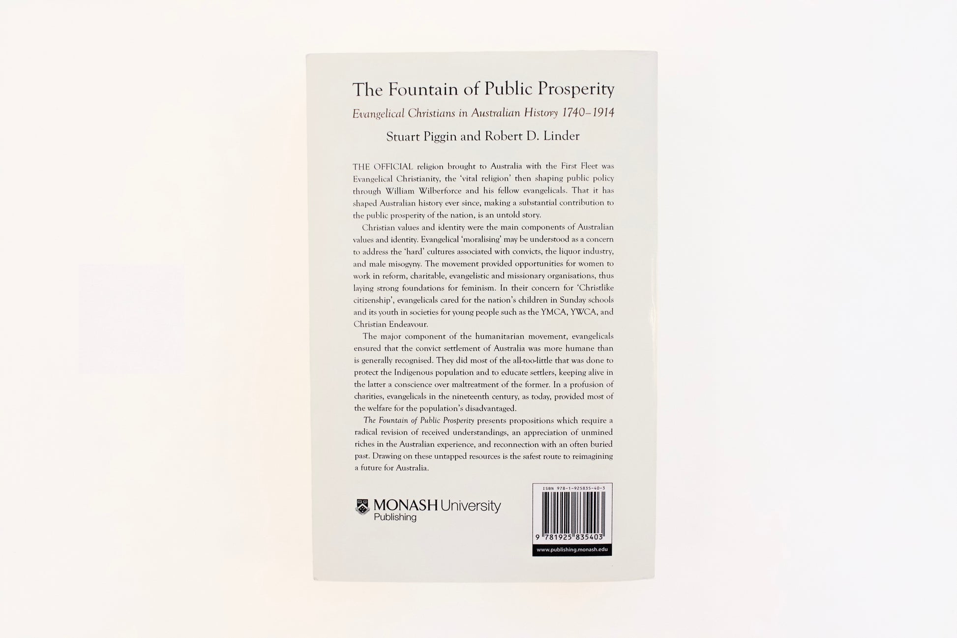 The official religion brought to Australia with the First Fleet was Evangelical Christianity, the 'vital religion' then shaping public policy through William Wilberforce and his fellow evangelicals. That it has shaped Australian history ever since, making a substantial contribution to the public prosperity of the nation, is an untold story. Christian values and identity were the main components of Australian values and identity. Evangelical 'moralising' may be understood as a concern to address the 'hard' cultures associated with convicts, the liquor industry, and male misogyny. The movement provided opportunities for women to work in reform, charitable, evangelistic, and missionary organisations, thus laying strong foundations for feminism. In their concern for 'Christlike citizenship', evangelicals cared for the nation's children in Sunday schools and its youth in societies for young people such as the YMCA, YWCA, and Christian Endeavour. The major component of the humanitarian movement, evangelicals ensured that the convict settlement of Australia was more humane than is generally recognised. They did most of the all-too-little that was done to protect the Indigenous population and to educate settlers, keeping alive in the latter a conscience over maltreatment of the former. The Fountain of Public Prosperity presents propositions which require a radical revision of received understandings, an appreciation of unmined riches in the Australian experience, and reconnection with an often buried past. Drawing on these untapped resources is the safest route to reimagining a future for Australia.
